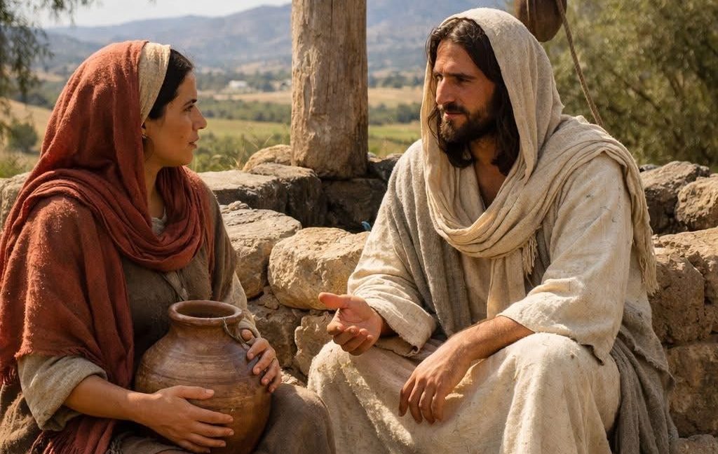 La historia la conocemos, Jesús  está cansado, sentado junto al manantial mientras sus discípulos han ido a buscar provisiones. Tiene sed pero  no tiene cubo y el pozo es profundo, pide agua a la mujer, ésta coquetea: “¿tú me pides de beber a mí que soy mujer, que estoy sola y soy samaritana?”